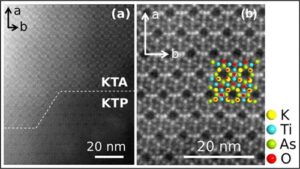 Twin-photon and triple-photon generations require pump laser intensities of several hundred MW cm–2. Micrometer-sized crystalline waveguides allow such interactions to be achieved at relatively low energies by taking advantage of the confinement of light. The materials selected to achieve these phenomena in the present work are from the titanyl phosphate family. The chosen architecture is a micrometric layer of KTiOAsO4 (KTA) grown on a KTiOAsO4 (KTP) substrate forming a planar waveguide in a first step. These two isostructural materials have a low lattice parameter mismatch (around 2%), making it possible to achieve high-quality epitaxial growth. Due to the refractive index of KTA being higher than that of KTP (Δn ≈ 0.043 at 1500 nm), this couple of materials could allow light to be guided in the deposited layer. To grow the KTA film, the chosen technique is pulsed laser deposition (PLD), which allows a nonlinear complex oxide layer of optical quality to be grown. In this study, we show that the growth is well oriented for layers with a thickness up to 200 nm after deposition under 32 mTorr of oxygen and a laser fluence of 0.8 J cm-2, forming epitaxial layers. Then, after annealing at 650 °C for 14 h, the crystal state is improved as well as the surface. However, our calculations show that the layer’s thickness has to be equal to 1.68 μm to achieve second-harmonic generation (SHG) at telecom wavelengths, which is the next step of this research. In this study we demonstrate the feasibility of KTA epitaxy over KTP by PLD with good epitaxial quality, good orientation, and theoretical phase-matching conditions for a planar KTA waveguide.