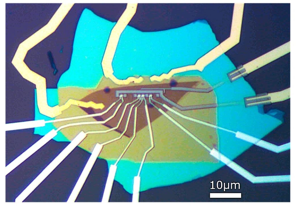 Image optique d’un condensateur quantique fabriqué à partir de matériaux bidimensionnels, incluant du graphène et des électrodes métalliques. Ce dispositif est conçu pour être refroidi à −273,14 °C et placé dans un champ magnétique intense, afin d’isoler des anyons dans des puits de potentiel électrique. © Alexandre Assouline, CNRS Institut Néel, 2025.