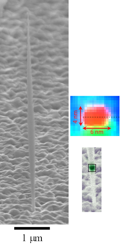 Semiconductor Quantum dots (QDs) have become the gold standard for on-demand single-photons, a cornerstone of quantum optics and communication. While most of the efforts are devoted to single photon emission in the so-called telecom band (1.5 μm) or in the near infrared, there is a growing demand for shorter wavelengths, in particular the blue-green range for free-space and underwater communication. We fabricate by molecular beam epitaxy (see Research activities / Epitaxy of semiconductors) CdSe QDs embedded in ZnSe nanowires, with typical dimensions as shown in the figure. They emit at 0.5 μm. The nanowire geometry allows us to obtain a high brightness (12 MHz repetition rate). Single photon emission is observed up to room temperature while keeping a good purity (ability to emit one and only one photon per pulse) [1].