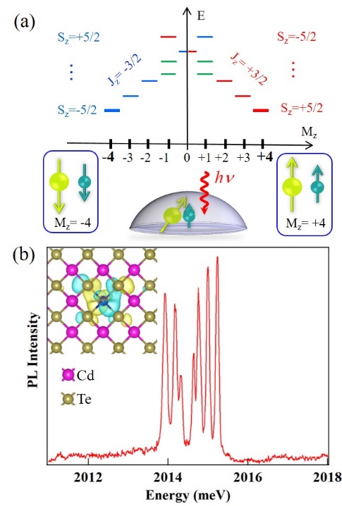 Figure 1: (a) Energy levels of the nanomagnet formed by the ferromagnetic coupling of the S=5/2 spin of Cr+ and the Jz=±3/2 spin of a heavy hole in a CdTe/ZnTe QD. (b) PL of a QD containing a hole-Cr+ nanomagnet. Circularly polarized excitation on the high-energy line allows the fundamental states Mz=+4 or Mz=-4 to be addressed. The inset shows a calculation of a Cr+ d orbital revealing hybridization with the Te orbitals. This hybridization is responsible for the exchange interaction with the hole spin.