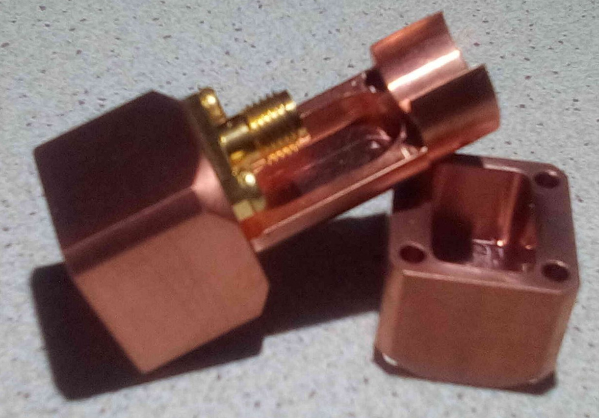 3D rectangular RF cavity (copper) resonant with the erbium spins at 12GHz with optical access (tiny holes)
