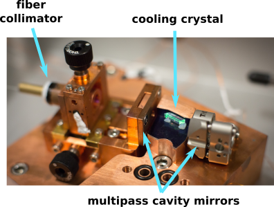 Photograph of the laser cooling experimental bench. The Yb:YLF crystal sits on 2 silica aerogel pads. The laser power is coupled through a fiber collimator inside a multipass cavity to be fully absorbed in the crystal. The green light in the crystal comes from the fluorescence of Er impurities.