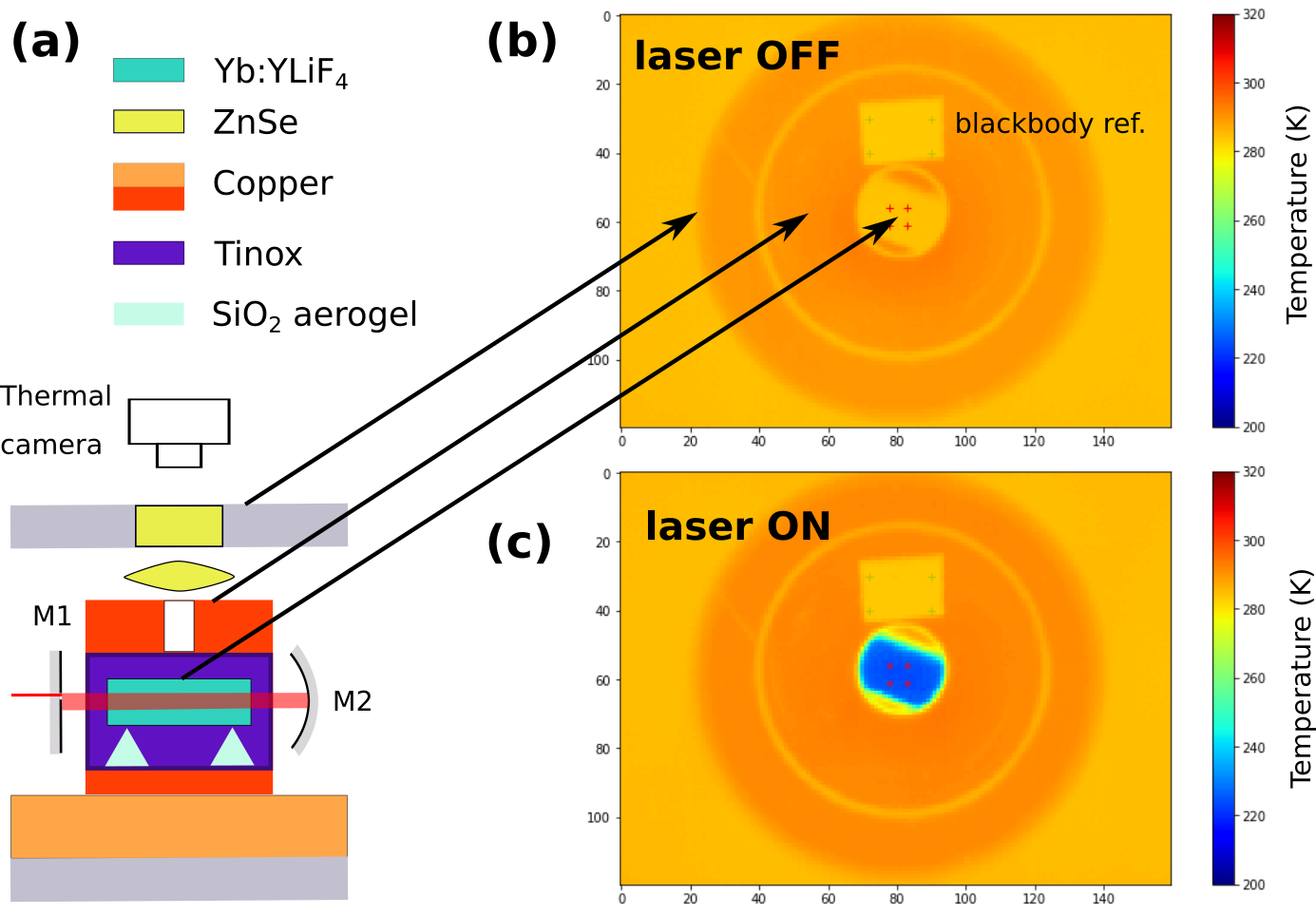 (a) cut of the experiment. A set of ZnSe optics allows recording its image on a thermal camera. (b) Thermal image with no cooling laser. The different temperature readings are due to the different emissivities of the materials and finite transmission of the lenses. (c) Same image when the cooling system is on.