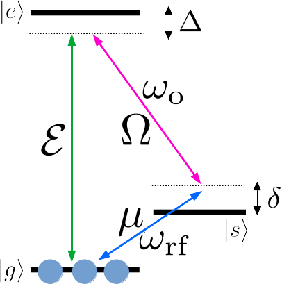 Doubly resonant level scheme. A strong optical field (magenta) is applied in a lambda system, where the optical (green) and RF (blue) signals are resonant with the other branches