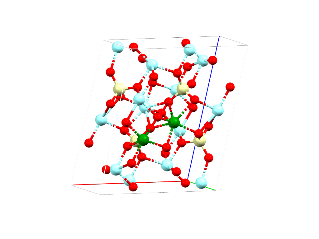 Unit cell of Y2SiO5. The two possible sites of erbium are represented in dark green. The dominant dipolar interaction occurs with the surrounding yttrium ions (light blue)