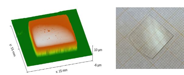 Thin Y2SiO5 crystal (10um) bonded to a glass substrate (left: profilometer depth scan, right: optical image).