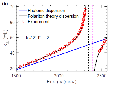 Evidence of exciton polariton in 2D halide perovskite. Open red dots: Energy dispersion of Fabry-Perot-like modes observed in Reflectance spectrum of a L = 6.6 μm thick layer of (C6H5C2H4NH3)2PbI4 for incident photons with wave vector k//z and electric field E ⊥ z (z axis being perpendicular to 2D (x, y) plane). Solid black curves: Simulation assuming 2D halide perovskite layer as a dielectric layer with complex Lorentz permittivity. Separation between vertical dashed lines = Longitudinal-transverse exciton splitting.