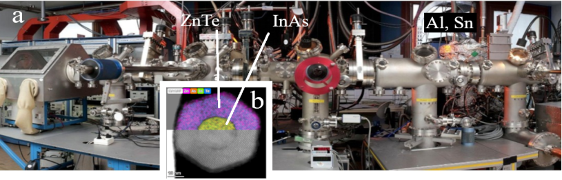 (a) the MBE cluster for II-VI / arsenides / metals; (b) cross-section of an InAs/ZnTe core/shell nanowire observed using transmission electron microscopy and energy-dispersive X-ray spectroscopy (courtesy Susheng Tan, Pittsburgh).